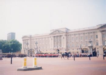 遠くからでもすごい人だかりが見えたので、Buckingham宮殿の場所はすぐ分かった。時間的には遅い方だったので、宮殿の柵沿いの特等地(?)は既に人で埋まっていた。それで柵の前は諦めて噴水の前にポジショニングし、隊列を待つ事にした。それにしても日曜という事もあってか、辺り一帯はすごい人・人・人。誇張でなく世界中から集まっているようだったが、どこの国の観光客もSONYのビデオカメラを携えているのには苦笑してしまった。