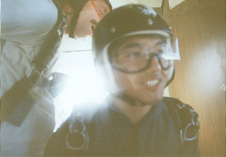 なお今回は初めてのジャンプという事で、オプションを頼んでエアカメラマンのラウルにビデオと写真を撮影してもらった。撮影から写真現像・VHS作製までコミコミで1回100ドルでお願いできる。ビデオは地上練習の段階から撮ってくれた。ラウルの英語はかなり早口で、ただでさえ緊張している所に聞き取りにくい英語で「日本の友達に一言」みたいな感じで云ってくるので、聞き取るのに神経使って全然気の利いたセリフが出て来なかった。今改めてビデオを見ると、冷静さを装っているものの明らかに緊張している様子が見て取れる(苦笑)