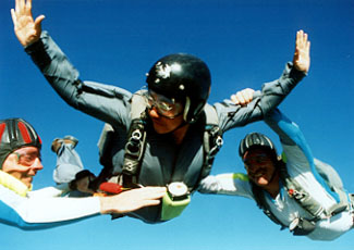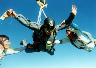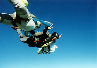 フリーフォールの途中でジャンマスに身体を掴まれたのを感じた。しかし後で尋ねたらEXIT直後からずっと掴んでいたと云う。確かに上の写真を見てもビデオテープを見ても最初から掴まれている。EXIT直後は五感が圧倒されていたのでそれに気付かず、あたかも途中で掴まれたように感じたのだった。